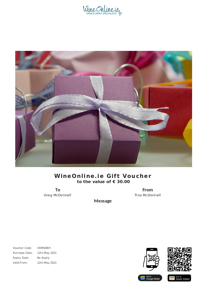 WineOnline.ie allows you to purchase instantly printable gift vouchers, special offers and tickets using the Voucher Connect platform.